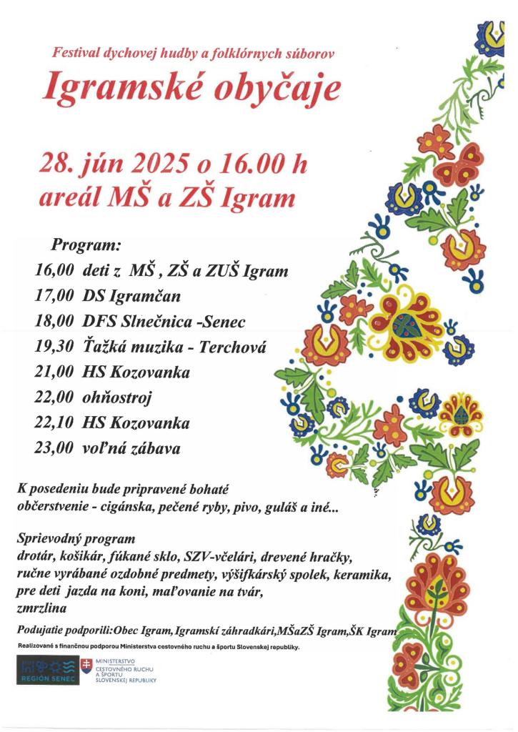 Festival dychovej hudby a folklórnych súborov sa uskutoční 28. júna 2025 o 16:00 v areáli MŠ a ZŠ Igram. Na programe sa predstavia deti z MŠ, ZŠ a ZUŠ Igram, folklórne súbory ako DS Igramčan a DFS Slnečnica, a známe kapely ako Ťažká muzika a HS Kozovanka. Okrem hudobného programu sa môžete tešiť aj na ohňostroj a bohaté občerstvenie vrátane cigánskej, pečených rýb a guláša. Sprievodný program ponúkne tradičné remeslá a zábavu pre deti.
